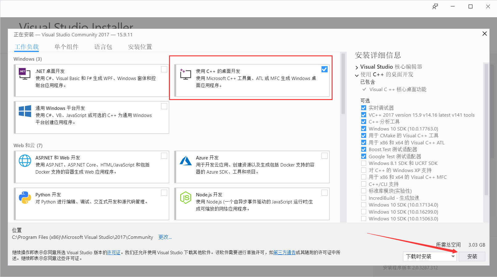 注意:不要勾选别的工作负载,即类似下图划红框的地方,否则安装程序会联网下载这些负载组件